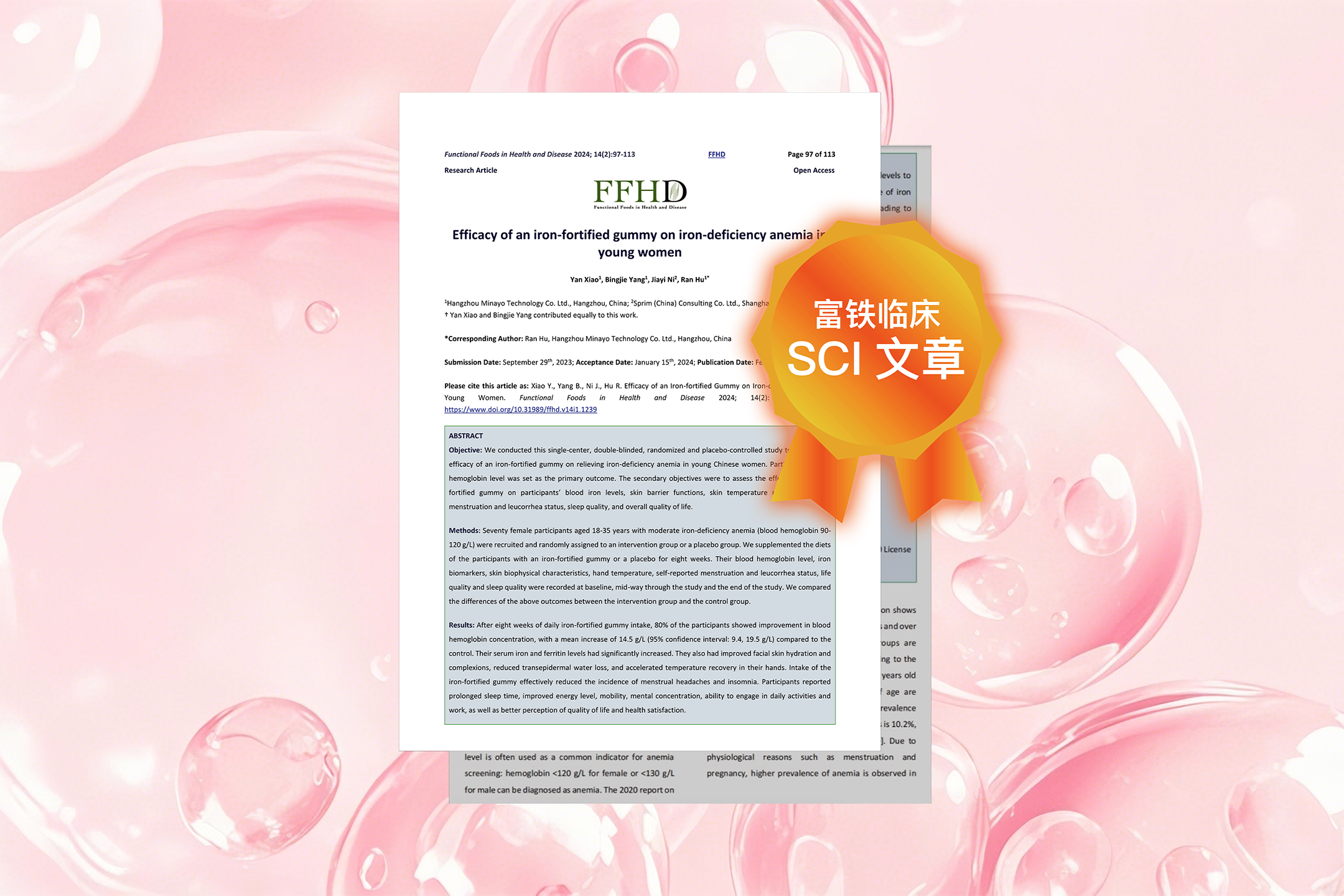 作为富铁软糖开创者,Minayo美那有富铁软糖研究论文《Efficacy of an iron-fortified gummy on iron-deficiency anemia in young women》,于2024年2月在美国SCI期刊《Functional Foods in Health and Disease》上发表。